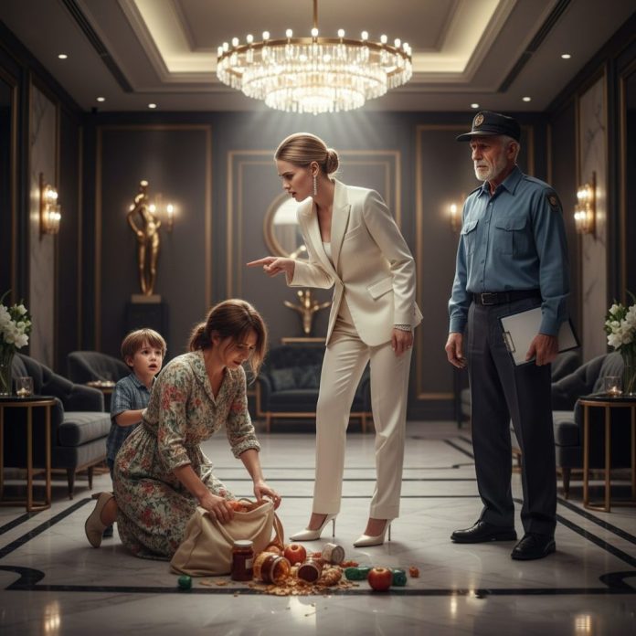 Just then, a young woman—an exhausted single mother from the third floor—entered the building with her little daughter. Her hands were full with grocery bags. One bag slipped, and apples rolled across the lobby floor. Richard instinctively bent down to help, but before he could, Vanessa snapped.