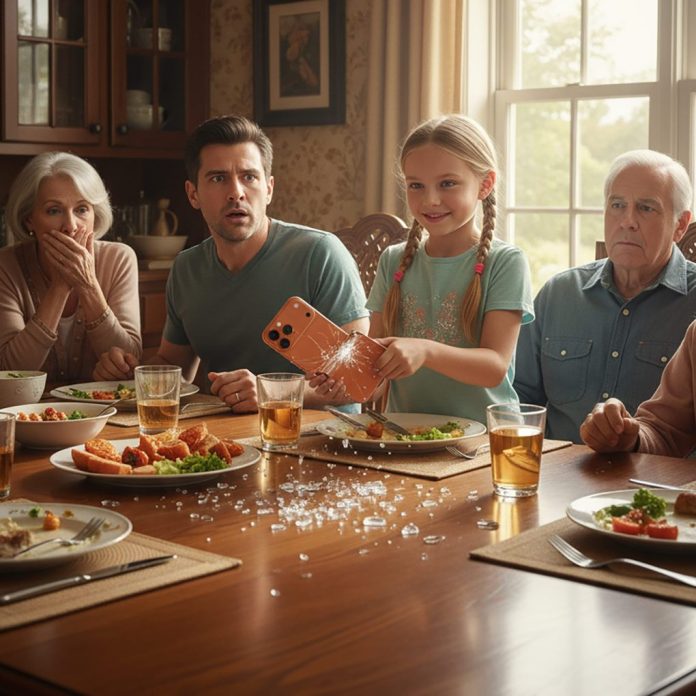 I froze. Around me, forks paused mid-air. My sister-in-law, Amanda—Chloe’s mother—looked away, pretending not to hear. My brother shifted uncomfortably. Before I could say anything, Chloe pressed her small hands against the phone’s sides and snapped it in half like it was nothing more than a plastic toy. The sound of the glass cracking echoed through the room.
