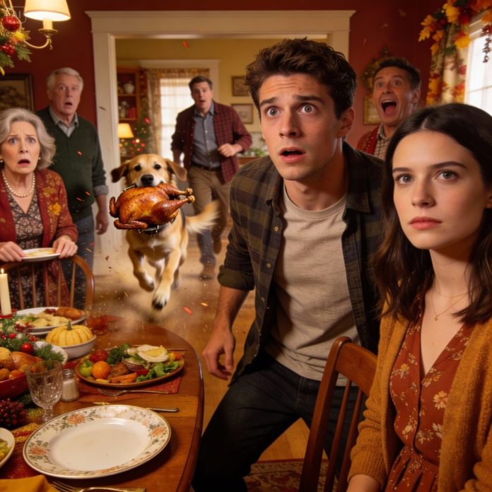 I brought my girlfriend home to meet my family for Thanksgiving. Everyone was suspicious. Then our family dog did what it does every year — stealing food from the table. But this time… it grabbed the entire ten-kilogram turkey, my mother’s pride and joy. We chased after it, hopelessly. Dinner was gone. The whole family stood in stunned silence. And right then, my girlfriend calmly said three words that froze the room… and sent my life in a completely different direction.