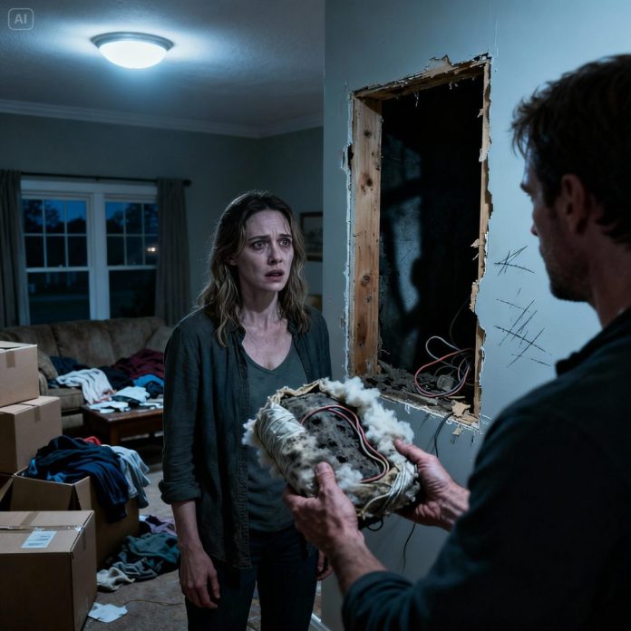 He led me down the hallway to the guest room—the one we hadn’t unpacked yet. He knelt by the wall near the closet and pressed on a section of paneling. It shifted slightly under his hand.