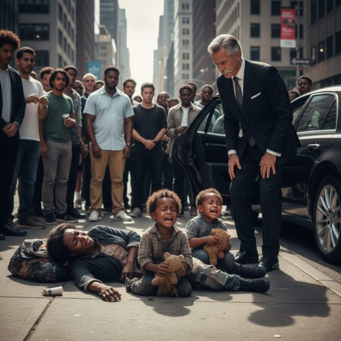 Harlow froze as he saw Danielle sprawled on the ground, the children sobbing beside her. For a fleeting second, he considered calling his assistant to handle it. But the desperation in the twins’ cries struck him in a way he hadn’t felt in years. He crouched down himself, ignoring the stares from pedestrians who had suddenly realized who he was.