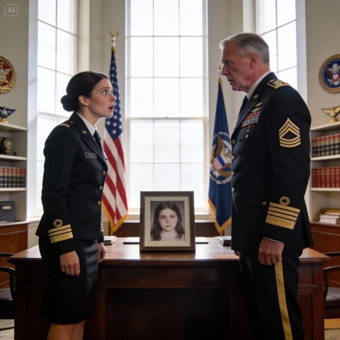While inspecting a general’s office, my eyes stopped on a photograph on his desk. My heart skipped — I recognized that face. “Sir… this girl once lived with me,” I whispered. He went pale, his lips trembling. “You mean… my missing daughter?” The air froze. And I understood — the truth buried for so many years was about to surface.