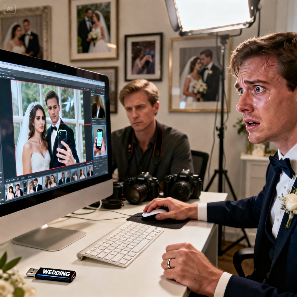 A week after my wedding, the photographer called, voice tight. “Sir… I need you to come in. Don’t tell your wife.” I laughed, thinking it was a joke—until he pulled up the photos. “Zoom in,” he said. My stomach dropped. “That can’t be real,” I whispered. He didn’t look at me. “I wish it wasn’t.” I walked out shaking, realizing the happiest day of my life had been built on a lie—and I was the last one to see it.