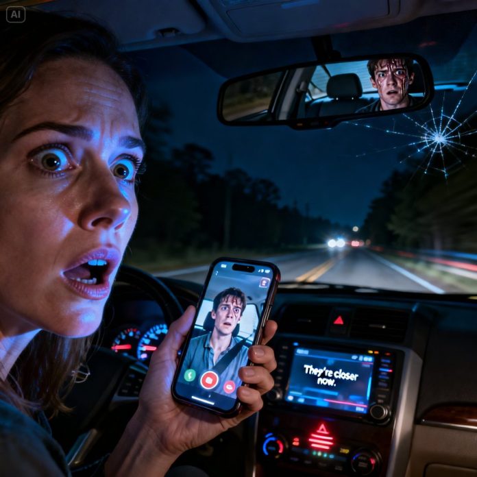 He didn’t answer. The sound of a turn signal clicked frantically, then stopped. Wind roared through the mic. The dashboard glow flashed across his face—sweat on his forehead, pupils too wide.