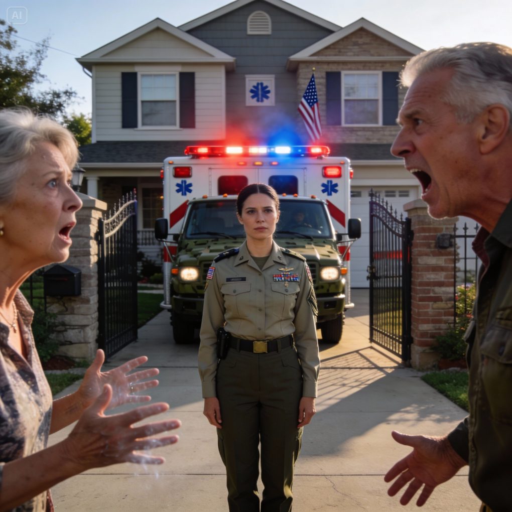 A military ambulance rolled up to the gate, siren screaming, lights cutting through the quiet street. Neighbors came out onto porches. Curtains twitched.