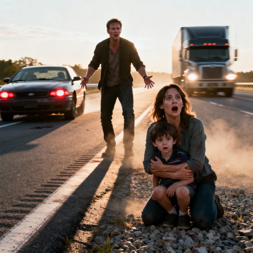 He opened my door, grabbed my arm, and practically dragged me out onto the gravel shoulder. Cold air hit my face. Cars screamed past inches away. I stumbled, trying to keep my footing while Ryan yanked Milo out of the back seat and carried him like a sack of groceries—fast, desperate.