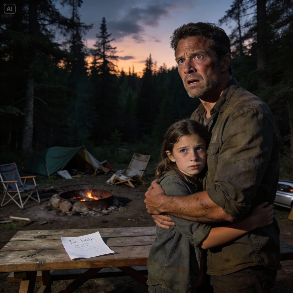 When my daughter and I came back from a ten-minute walk, the campsite was silent. No tents. No cars. No people. “Dad… where is everyone?” she whispered. On the table, a single note waited: This is for the best. Trust me. No signal. No food. No way out. They thought the forest would finish us. They were wrong—and twelve days later, they learned why.