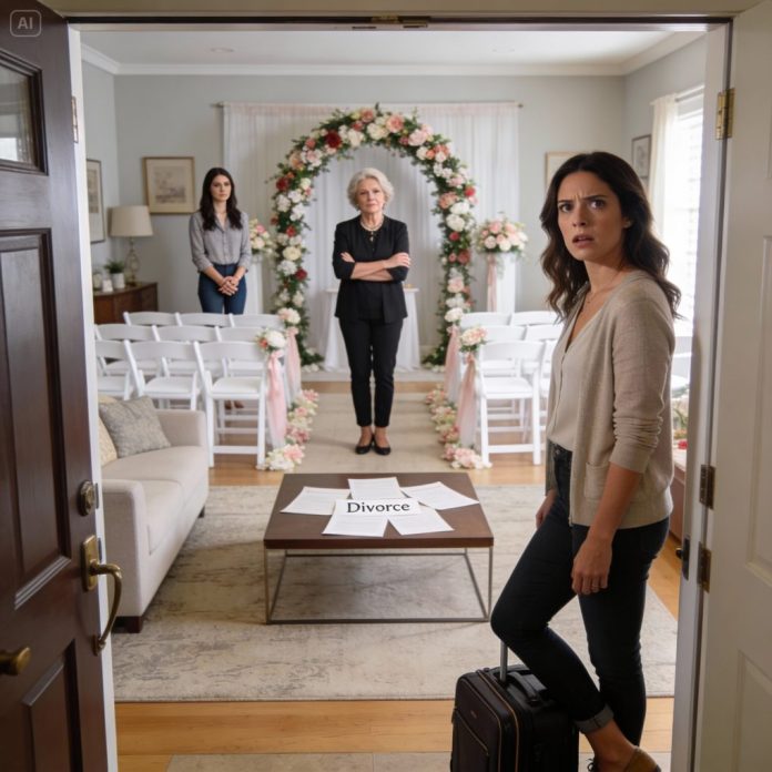 I dropped my suitcase by the door and stepped inside, my heart tightening with every step. White flowers covered the staircase railing. A banner hung crookedly above the fireplace. Folding chairs lined the walls like an audience waiting for a performance I had never agreed to attend.