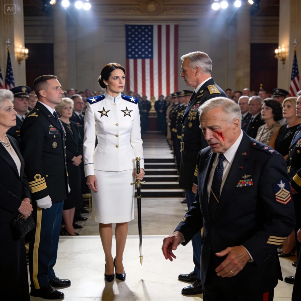 “At least the military pays her rent,” my father shrugged in front of the crowd. I stepped in — dress uniform immaculate, ceremonial sword at my side, two stars on my shoulders. The entire hall fell silent. The general looked at me, then turned to my father and asked slowly, “Is that your daughter?” And in that moment… I watched the color drain from his face.