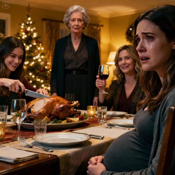 Then Kara let out a sharp laugh, loud enough to slice the silence. She didn’t even look up. “So,” she said, sawing into the turkey with exaggerated calm, “who’s the dad? Another one-night stand?”