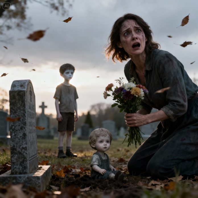 I grabbed Leo’s hand and ran—not toward the center of the cemetery, but toward the main path where other visitors might be. Gravel crunched under my shoes. My lungs burned. Leo’s small hand was sweaty and trembling, but he kept up, eyes fixed on the gate like it was the only doorway back to life.