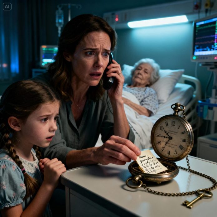 My grandmother was hospitalized because of her age, so we went to visit her. While the adults chatted, my 8-year-old daughter tugged my sleeve and whispered, “Mom… grandma said to check the clock.”I glanced at the pocket watch sitting on the bedside table and picked it up, confused. The metal felt cold in my palm. I flipped it open——and in that instant, my stomach dropped.My hands started shaking as I snapped it shut, backed away from the bed, and grabbed my phone. I didn’t even think. I just called the police.