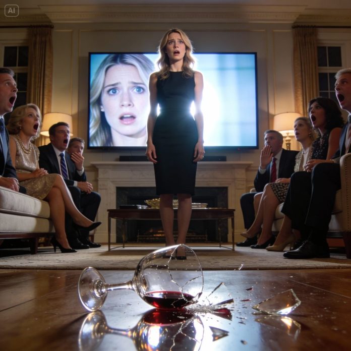 A crystal glass slipped from someone’s hand and shattered against the marble floor. The sound echoed, loud and final. Everyone turned—slowly, collectively—toward the large television mounted above the fireplace.