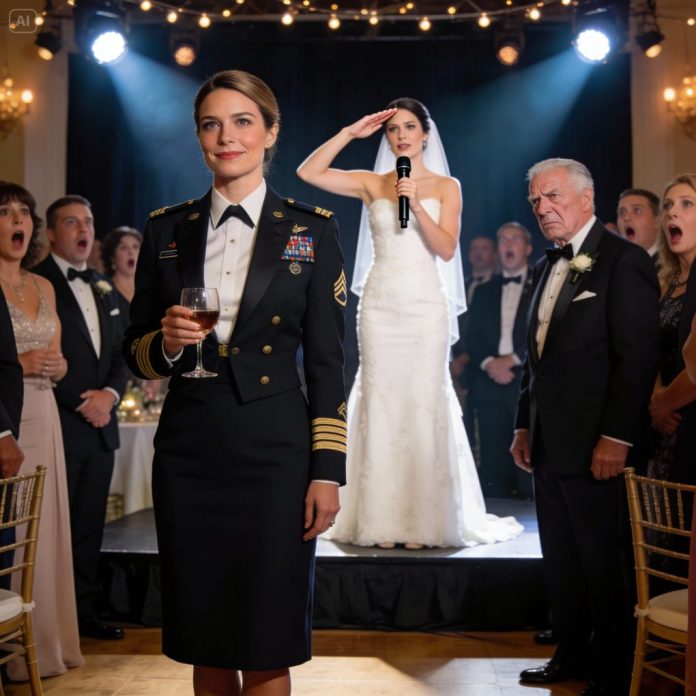 As the ceremony ended and the reception began, the bride—Ethan’s fiancée, Claire—stepped onto the small stage with a microphone. She looked radiant, confident, scanning the crowd with a knowing smile.