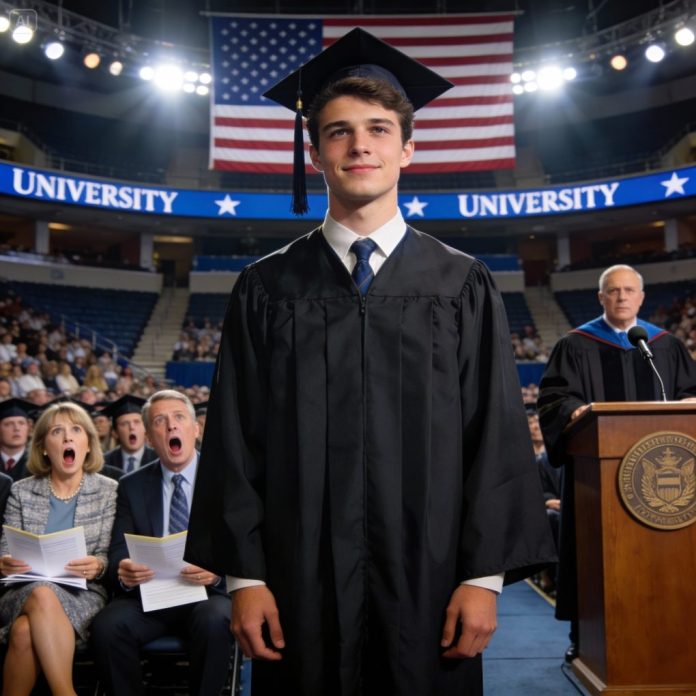 “Please welcome our youngest billionaire graduate, founder of NexaCore Solutions.”