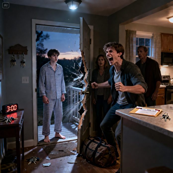 At 3 a.m. my door exploded inward and my stepbrother roared, “I want his room, and I want it now!” I stood there shaking as my parents froze behind him. “You can’t do this,” I said—but he laughed. That laugh still echoes, because what he didn’t know was that the house wasn’t theirs anymore, and dawn was about to change everything.