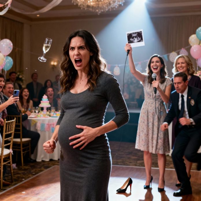 At my own baby shower, my sister grabbed the mic and held up my ultrasound. “Look! Her baby’s disabled!” she laughed. My mother chuckled, “only an idiot would keep trash like that.” I stood up, furious. But before I could speak, my sister kicked me in the stomach with her heel. And what happened next… changed everything.