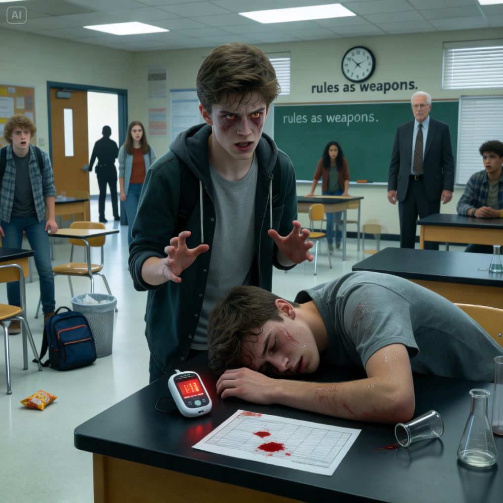 They patted us down at the door, tossed our lunches, and laughed, “Cafeteria food is enough.” In biology, I watched my friend Baxter slump, his monitor screaming as his sugar crashed. “Please,” I begged, “he needs help.” The teacher shook her head, eyes on the clock. As blood pooled on the desk and the room froze, something inside me hardened—because rules had just become weapons, and I was done staying quiet.