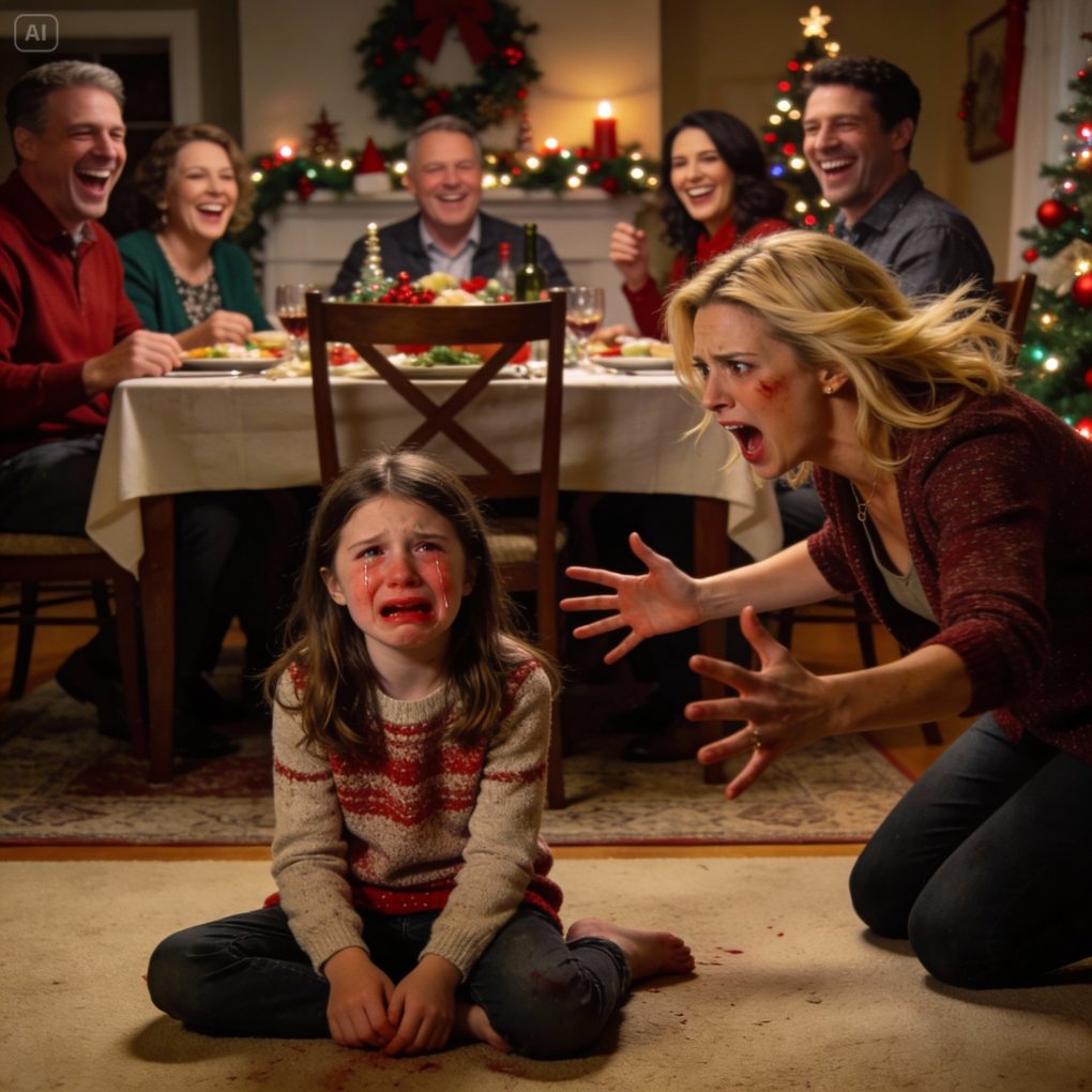 My dad pushed my 9-year-old daughter at the Christmas table. “That seat is for my real grandkid. Get out!” She hit the floor in front of the whole family—but everyone stayed silent. I didn’t cry. I said four words. My mom dropped her wine glass. My dad went pale…