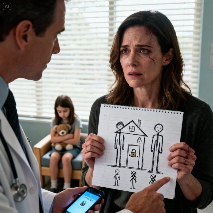 It was a child’s drawing—simple lines, stick figures, a room with a door. But one detail hit me like a punch to the chest.