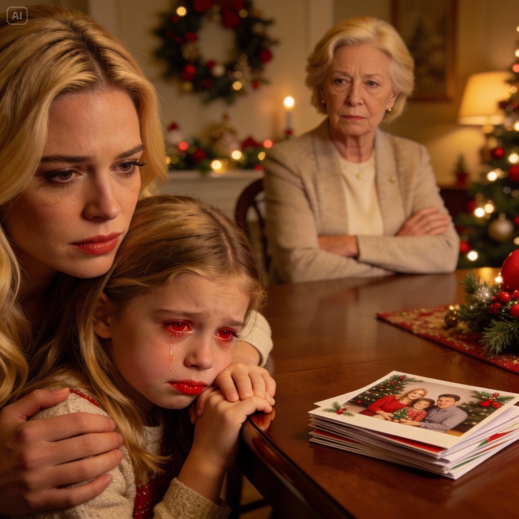 At the family photo shoot, my 6-year-old daughter sat in the front row smiling. We got the Christmas cards back — and she’d been photoshopped out of every single one. She burst into tears when she saw it, asking what she’d done wrong. I didn’t yell. I did this. The next morning, my mom opened her gift and went pale…
