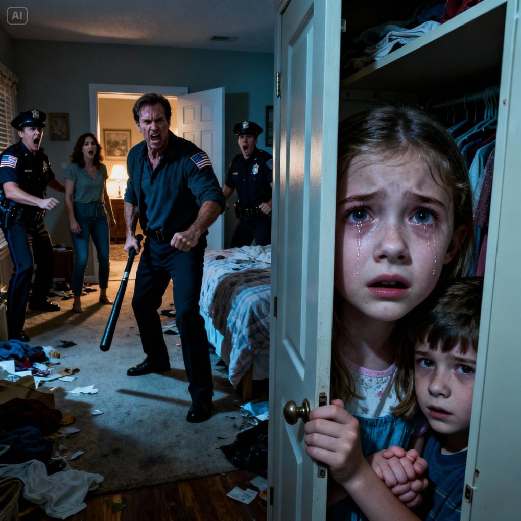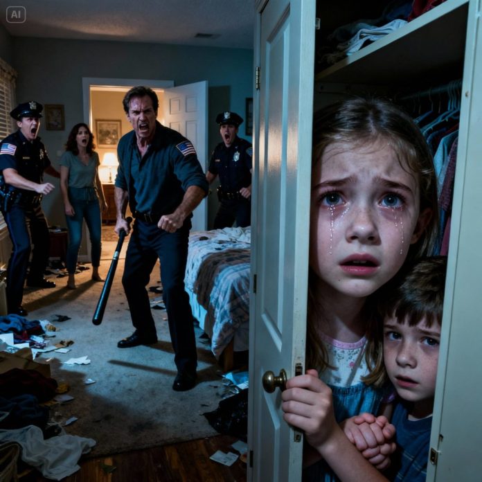 Down the hallway, Lily was still hiding—she didn’t know the police were just steps away. She only knew the shouting meant her mother was still in danger. Holding her brother’s hand tightly under a blanket, she pressed her face into the closet wall, trying not to scream.