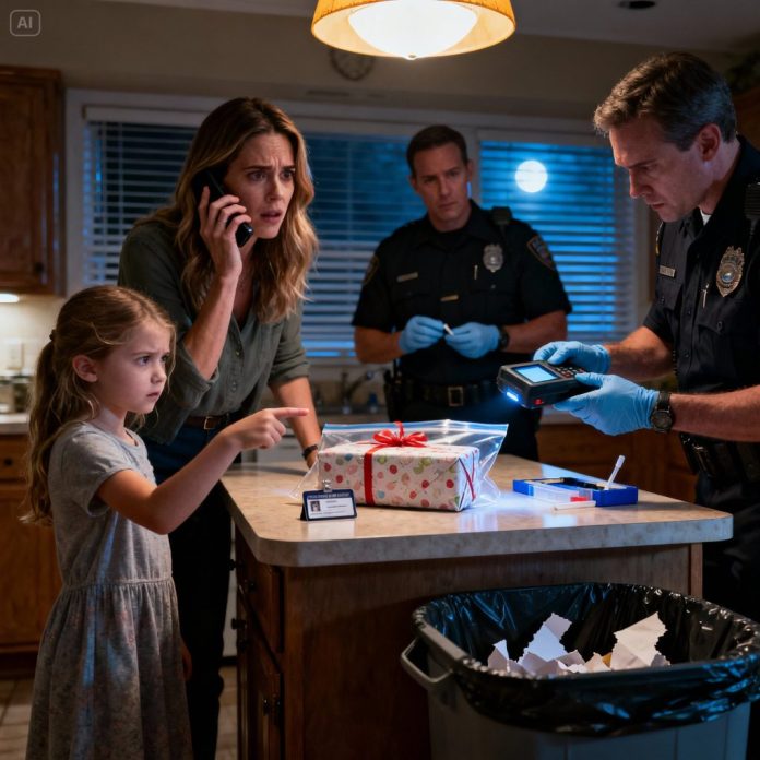 Officer Ramirez lifted the gift box out of the trash with both hands and set it on the counter. He pulled out an evidence kit from his patrol bag—gloves, a clear bag, tape. He did not unwrap it.