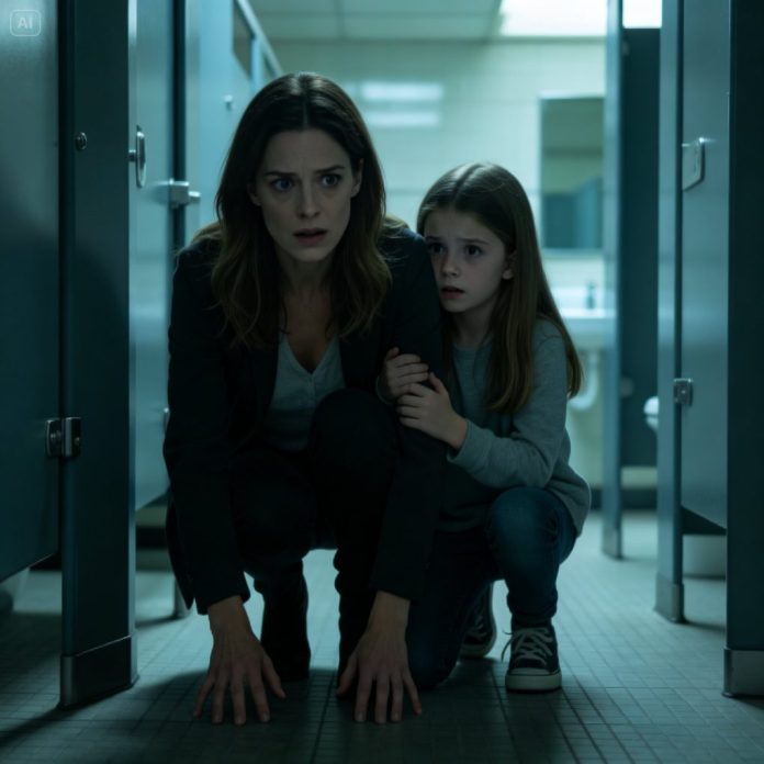 There, near the bottom of the stall wall, was something that didn’t belong—something deliberately placed. Not an accident. Not harmless. My heart slammed so hard I felt dizzy, but I forced myself to stay calm. Lily was watching my face closely, searching for a cue on how scared she was allowed to be.