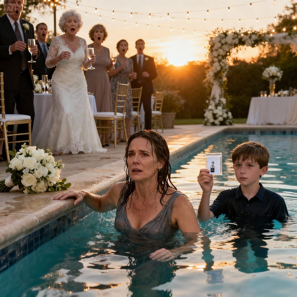 My pulse pounded as I pulled myself up the pool steps, wet clothes clinging and heavy. Guests stared, whispering, phones hovering. I could feel the humiliation crawling up my neck, but something else crawled over it—cold clarity.