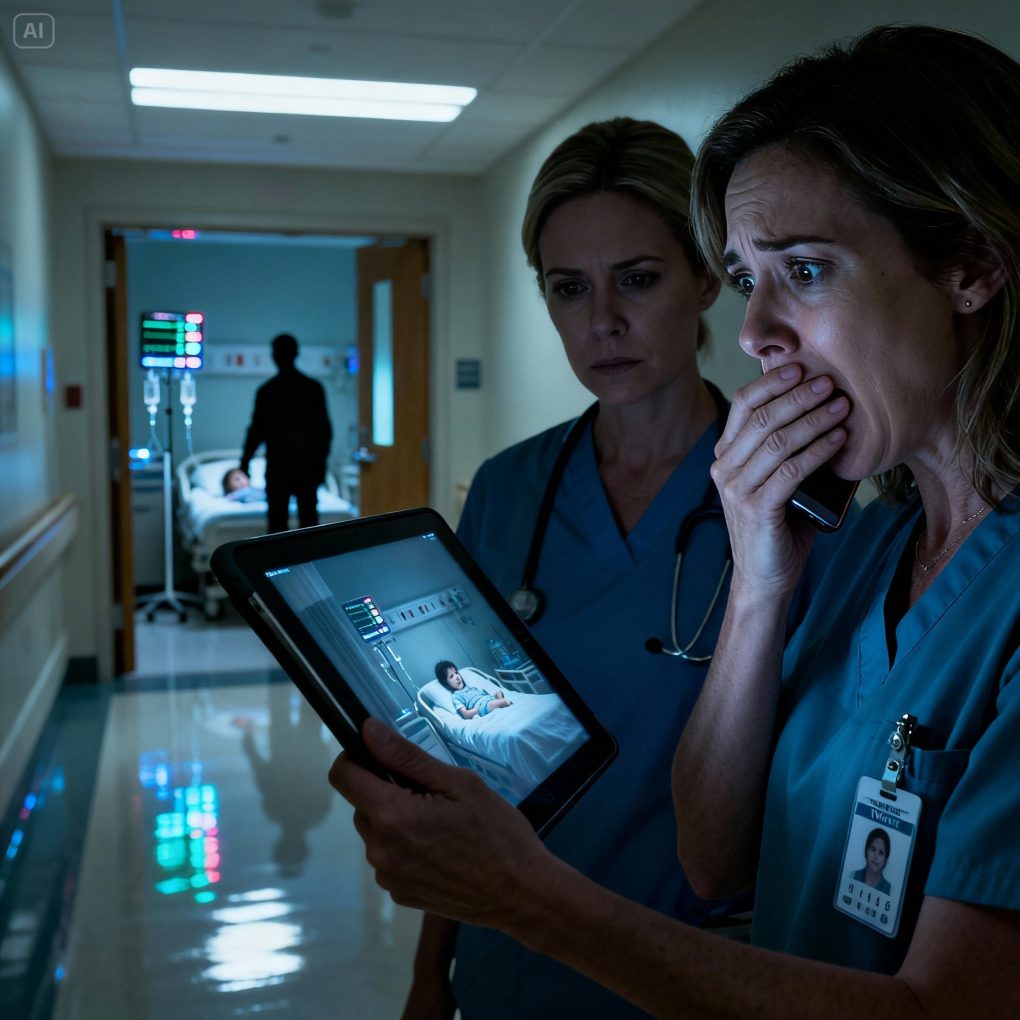 That “something else” made my skin go cold. I followed her out, the hallway lights brighter than my tired eyes wanted. She led me to a small workstation near the nurses’ desk where a security monitor displayed multiple camera feeds—corridors, elevator lobbies, supply rooms. She clicked a mouse and pulled up a recorded clip.