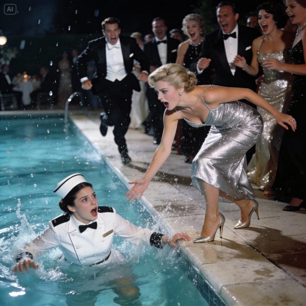 Water rushed over my head, cold and choking, my shoes dragging me down for half a second before instinct kicked in. I kicked hard, broke the surface, and gasped for air. My uniform clung to my body, heavy and see-through, every stain and wrinkle exposed under the pool lights.
