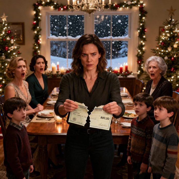 Emily’s eyes filled with tears. Liam clutched her sleeve. Sarah looked from her mother to her sisters — three faces she’d once trusted with her heart — and something inside her broke. Reaching into her purse, she pulled out a white envelope. “You think I can’t afford it?” she said quietly. “I just got paid $800,000 for my latest contract.” Then, before anyone could react, she tore the check into pieces and let them fall like snow on the table.