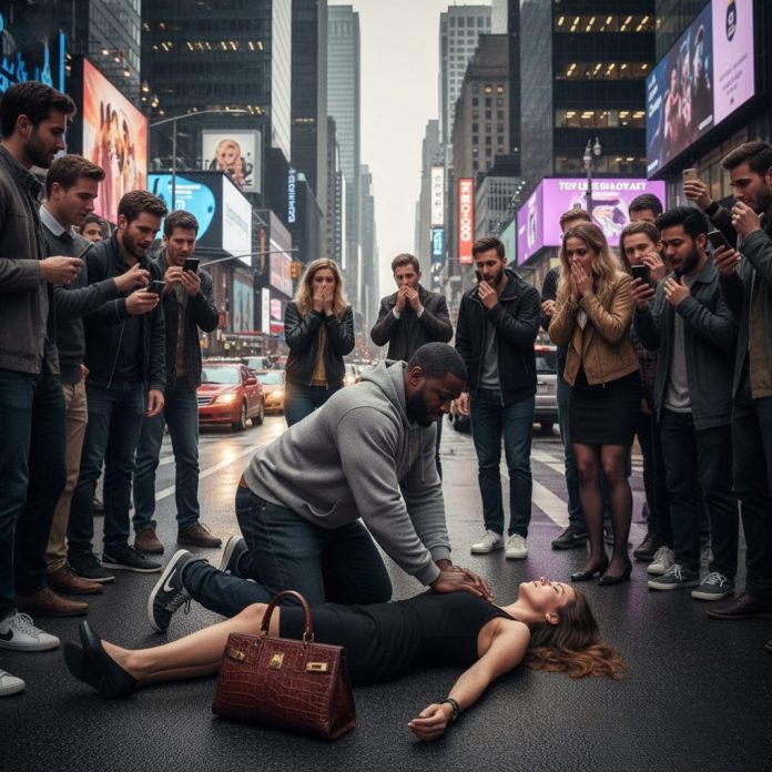 Among the crowd was Marcus Reed, a thirty-six-year-old single father who had just gotten off his second shift as a delivery driver. He was holding a small grocery bag with milk and bread, heading home to his seven-year-old daughter, Laila, when he noticed Victoria clutch her chest and fall. While others stood paralyzed or fumbled for their phones, Marcus dropped his bag and ran forward.