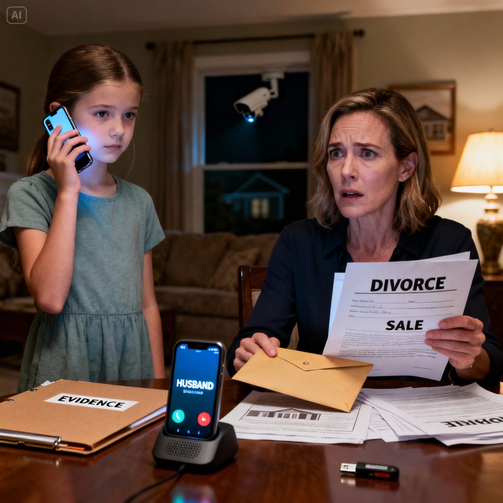 My husband sent me an envelope containing the divorce papers and documents proving he had sold our house. “Everything went according to plan. I’ll take everything and start a new life with her.” I was speechless. But my 10-year-old daughter quietly picked up her phone. “Mom… he still doesn’t know,” she whispered. She sent a message, and one minute later, my husband’s voice was trembling.