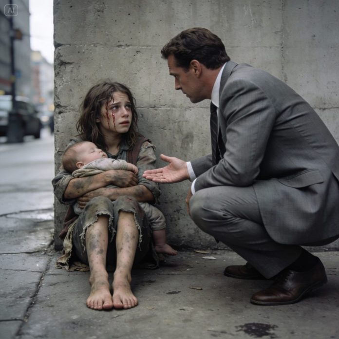 Her voice was so soft it barely rose above the hum of the city. I looked down and saw a child no older than six, her face smudged with dirt, her shoes mismatched, her fingers trembling as they clutched my jacket like it was the only solid thing left in her world.