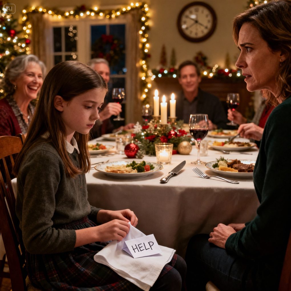 Mila was seven. Usually she’d be bouncing in her chair, sneaking bites before grace, whispering jokes to her cousins. Tonight, she didn’t touch her fork. Her shoulders were tight, chin tucked down, eyes fixed on the table like it might disappear if she stared hard enough.