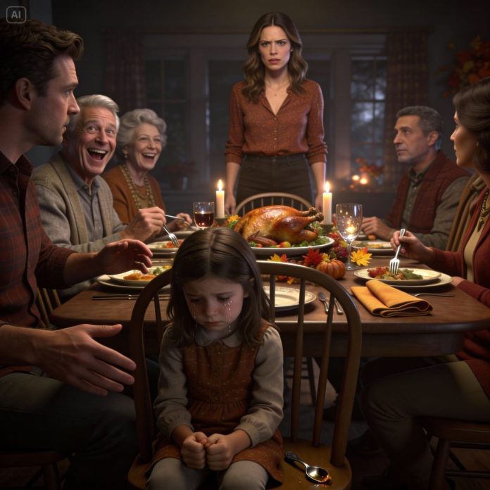On Thanksgiving, I watched my six-year-old daughter freeze as my in-laws mocked her accent, laughing, “Adults only, sweetheart.” My husband squeezed my hand and whispered, “Let it go.” I smiled and said nothing while my daughter’s eyes filled with tears. Five minutes later, when I finally stood up and spoke, the table went silent. Even now, I wonder if they regret what they taught her that night.