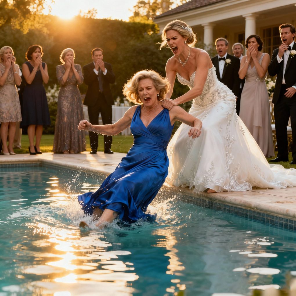 Before anyone could react, Madison shoved Linda — hard. Gasps erupted as the older woman plunged into the pool, her elegant blue gown ballooning under the water.