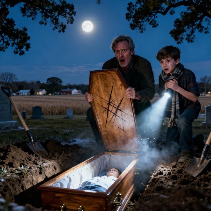 When eight-year-old Dylan begged his father to dig up his mother’s grave, everyone thought grief had driven him mad. But what they discovered inside the coffin that night in rural Kansas left the entire town speechless — and the police on high alert.