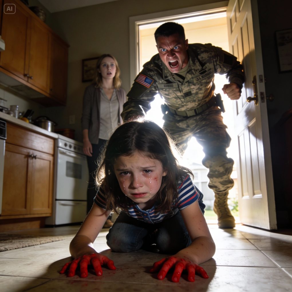 The little girl knelt on the floor, her tiny hands red and hurting. Her stepmother towered over her, shouting, “Clean it! If you don’t finish, you don’t eat!” Exhausted, the child collapsed, gasping for air. Suddenly, the door burst open. Her father—a soldier—had come home earlier than expected. He froze, then roared, “My daughter… who did this to her?!” The stepmother went pale, and the little girl whispered, “Daddy… it hurts…” And the father’s fury began to rise..
