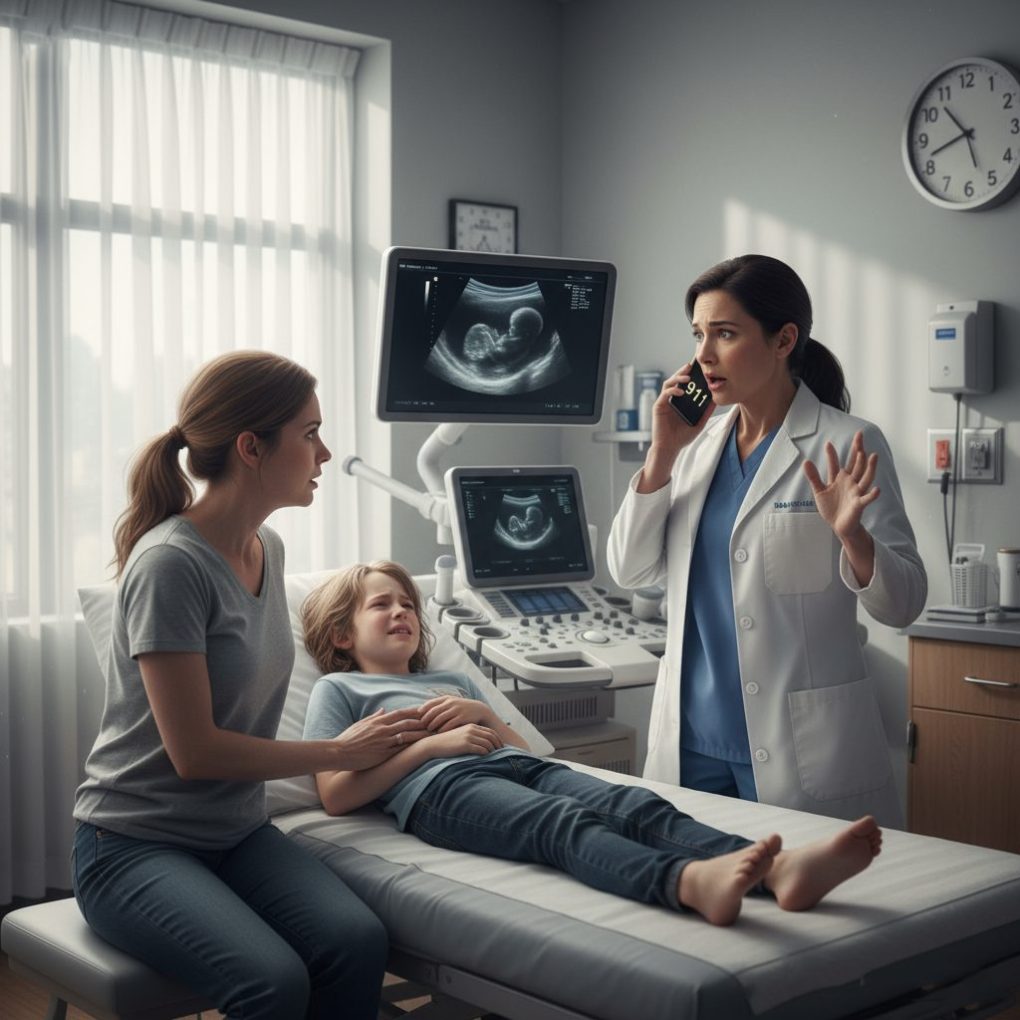 At the clinic, Dr. Patel gently pressed on Emily’s abdomen, his brows furrowing. “Let’s get an ultrasound to be sure,” he said, trying to stay calm. Sarah held Emily’s small hand as the machine began to hum. On the screen, shadows flickered — something didn’t look right. Dr. Patel’s face changed instantly. He stepped out of the room, whispering something to the nurse. Moments later, he returned, his voice firm but controlled. “Sarah, we’re calling 911. Your daughter needs to go to the hospital right now.”