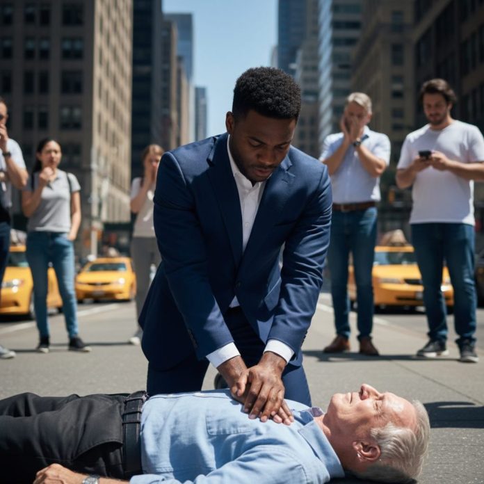 For a second, Marcus froze. People walked past, glancing but not stopping. Then instinct kicked in. He dropped his bag, ran across traffic, and knelt beside the man. The stranger’s face was pale; his mouth struggled to form words. Marcus dialed 911, performed CPR under the dispatcher’s guidance, and stayed with the man until the ambulance arrived.