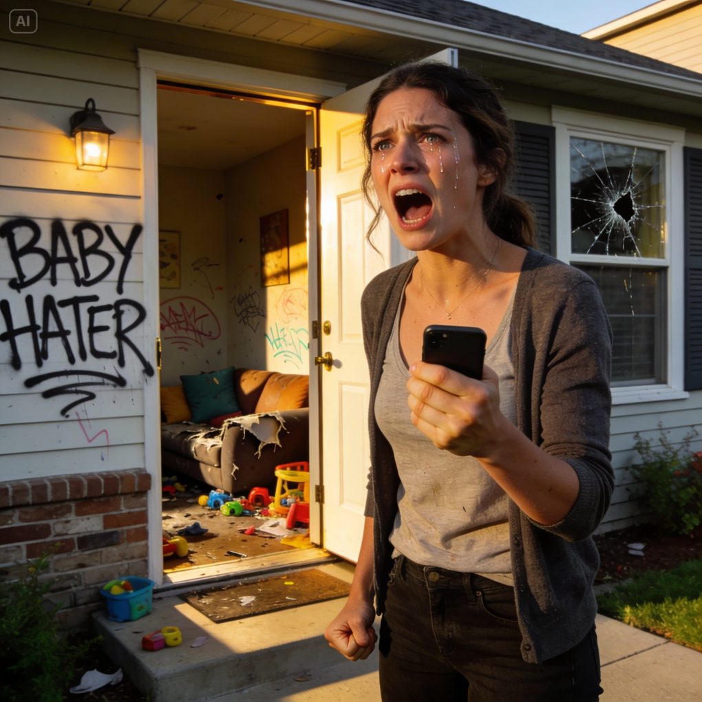 When I finally stepped out, the smell hit me immediately—spray paint, sharp and chemical, clinging to the air like poison. My hands trembled as I pushed the front door wider.
