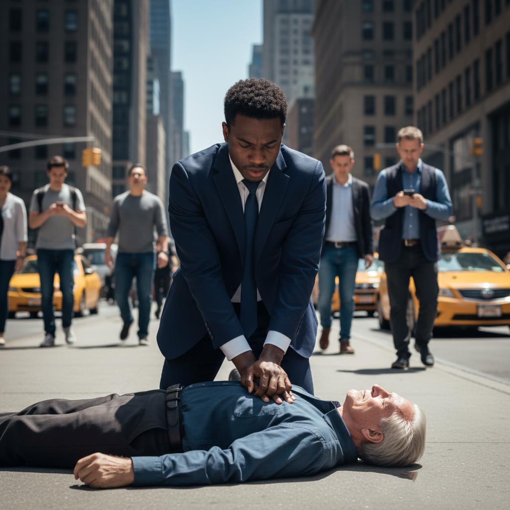 As he crossed the street, he noticed a man in a navy suit collapse onto the sidewalk near the entrance of a coffee shop. At first, pedestrians slowed but then continued on, unsure of what to do. Marcus dropped his folder and rushed forward.