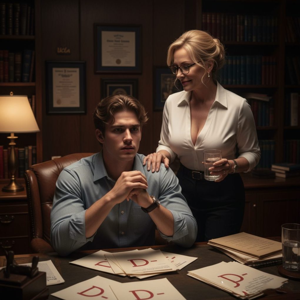 I swallowed hard. My heart thudded as she slid my final exam toward me. “You’re close to passing,” she said, leaning forward. “I could… reconsider your grade, but I need to know how badly you want it.”