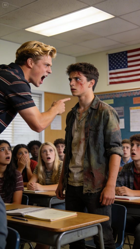Ethan Walsh froze. He stood beside his desk, holding a frayed backpack that had long lost its original color. His shoes were unevenly worn, one lace replaced with a piece of twine. His shirt, while clean, had faded from countless washes. None of these things embarrassed him at home, but here, under the fluorescent lights and the scrutiny of his classmates, every flaw seemed to burn beneath their gaze.