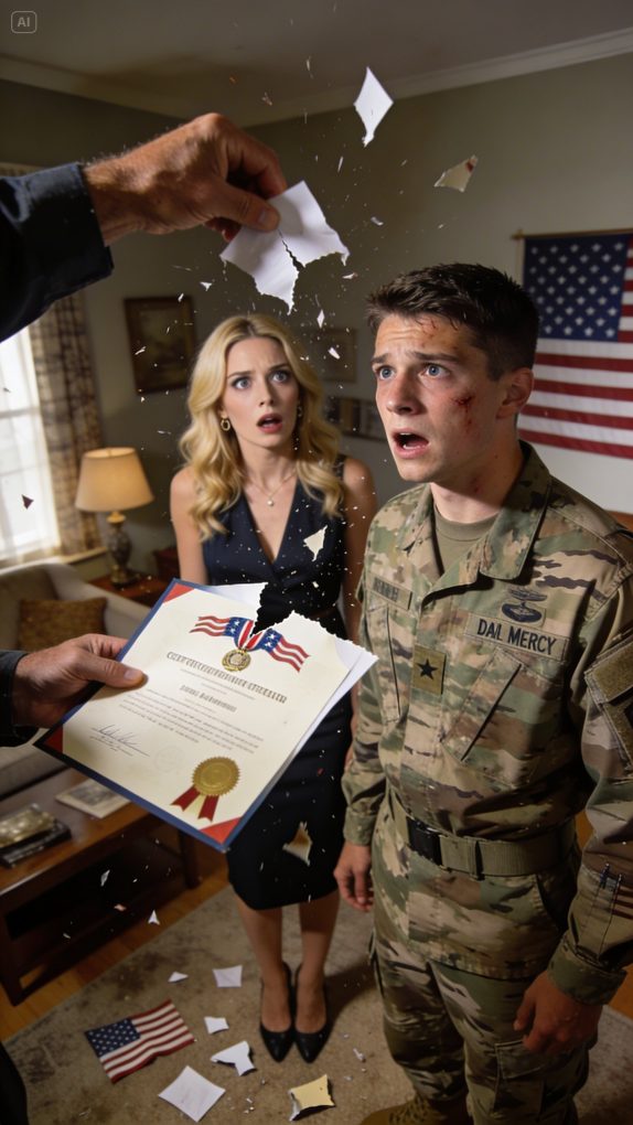 The day after the flood rescue, Nathan Hale sat alone on the edge of his bunk, the early sunlight slipping through the barracks window. In his hands was a small envelope containing nothing more than the remains of a commendation certificate—creased, torn clean down the center. His father’s voice still rang in his ears like a hammer striking metal: “Can that piece of paper buy food?” And behind it, his mother’s sharper tone: “You think being a soldier is impressive? In the end, you’re just a hired hand for the government.”