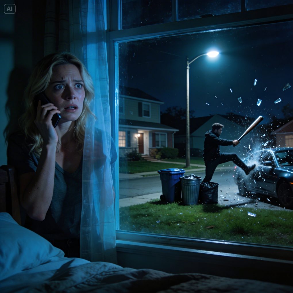 “There’s a man outside my house,” I whispered. “He’s vandalizing my car. He has a bat.”
