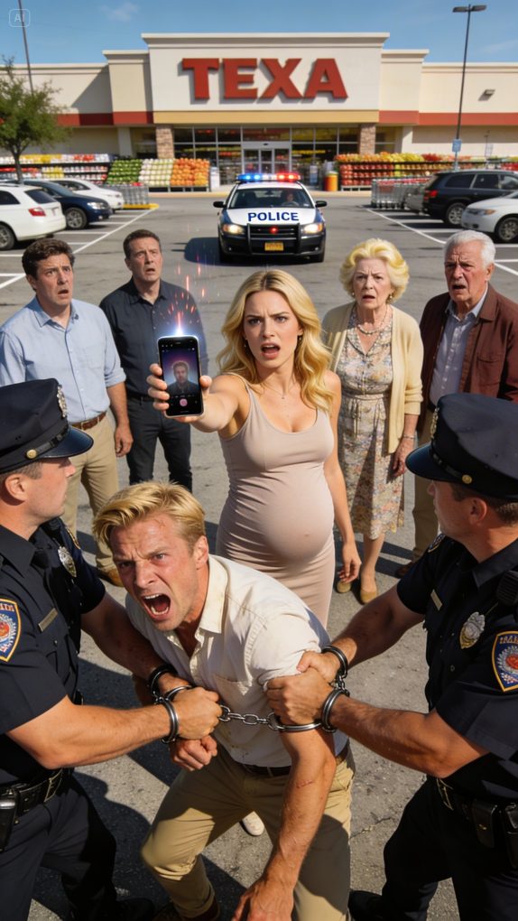 In a Texas supermarket parking lot, she held her swollen belly while struggling to pull heavy water crates for her husband’s family. He laughed coldly. “Pregnant? And so what? You’re only good at giving birth. You’re useless otherwise.” Her mother-in-law scoffed. “Stop pretending you’re fragile. Every woman goes through this.” She remained silent, unlocked her phone, and hit play. His voice echoed through the speakers of a police cruiser: “I’ll cause you to lose the baby if you try to leave.” The cuffs clicked shut. The parking lot went deathly still.