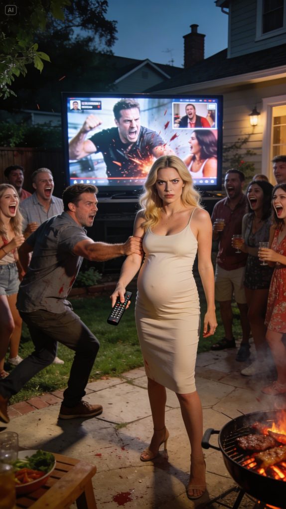 At a backyard BBQ outside Chicago, the pregnant wife was made to grill meat, surrounded by thick smoke. He lifted his drink and sneered, “Cheers to my baby-making machine.” His friends roared with laughter. One of them mocked, “Let’s bet how long she can take it.” She calmly wiped the sweat from her brow. “I can take it,” she said quietly, “until right now.” She snapped her fingers. The television came alive with a live stream — showing him pounding the table, screaming at his wife, confessing to cheating, and openly admitting to tax fraud. The laughter vanished. She held up her car keys. “I’m here to walk you out.”